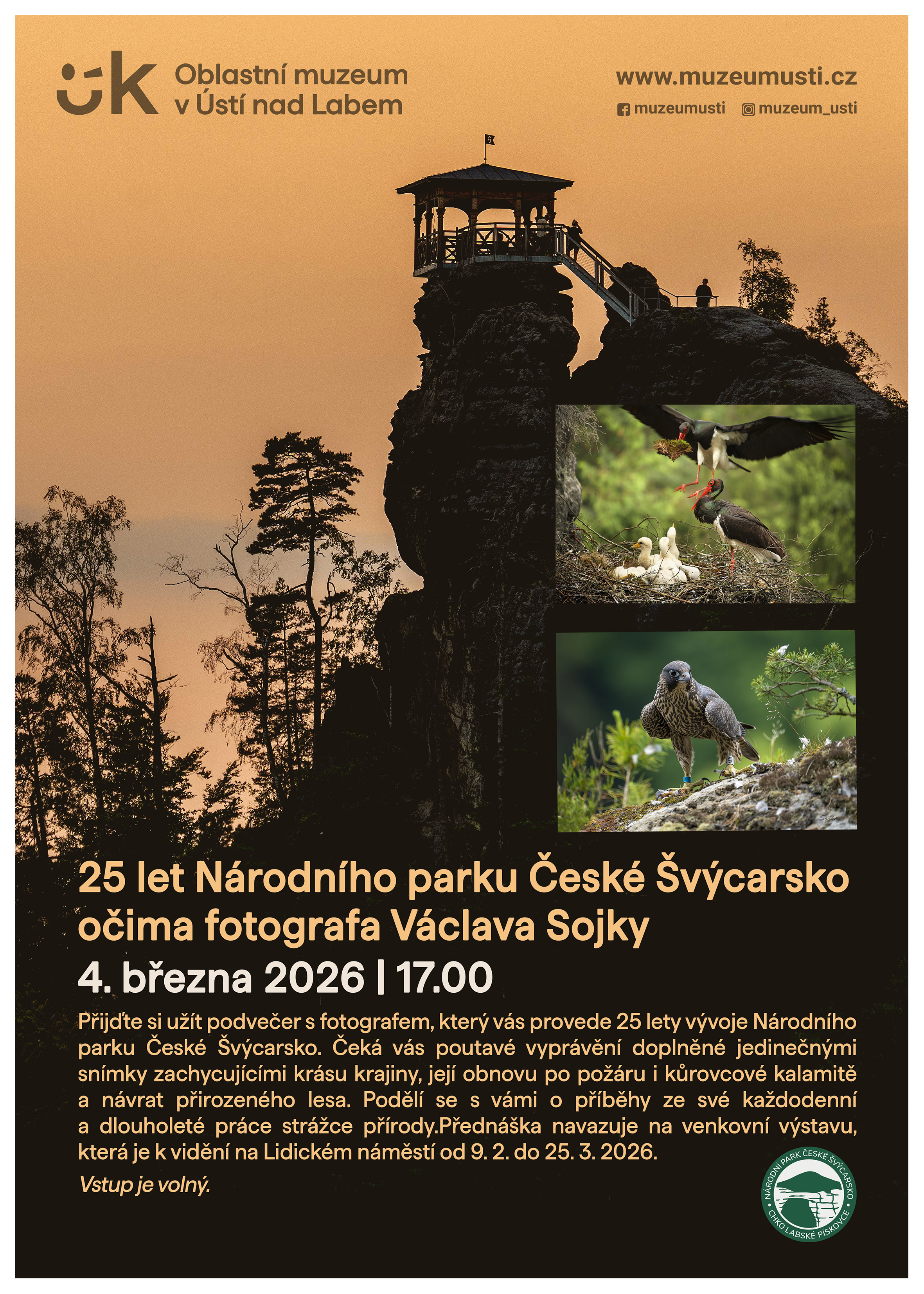 Přednáška navazuje na outdoorovou výstavu PRO LIDI I PŘÍRODU – 25 LET NÁRODNÍHO PARKU ČESKÉ ŠVÝCARSKO, která je k vidění na Lidickém náměstí v Ústí nad Labem od 9. 2. do 25. 3. 2026 a výstava je volně přístupná.