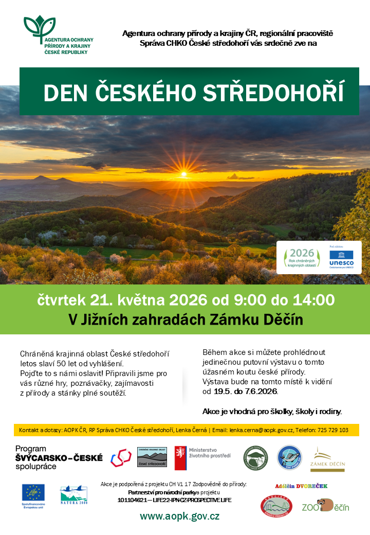 Chráněná krajinná oblast České středohoří letos slaví 50 let od vyhlášení. Pojďte to s námi oslavit! Připravili jsme pro vás různé hry, poznávačky, zajímavosti z přírody a stánky plné soutěží.Během akce si můžete prohlédnout jedinečnou putovní výstavu o tomto úžasném koutu české přírody. (Výstava bude na tomto místě k vidění od 19.5. do 7.6.2026.)