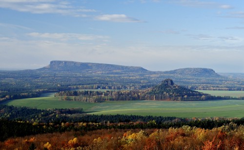 K nejznámějším vrcholům vulkanického původu patří Růžovský vrch, dominanta a nejvyšší vrchol NP České Švýcarsko (viz foto), Český vrch, Suchý vrch, Goliště, Mlýny, Sokolí vrch, Strážiště, Vosí a Větrný vrch a také Vlčí hora, která však leží již mimo pískovcový podklad.