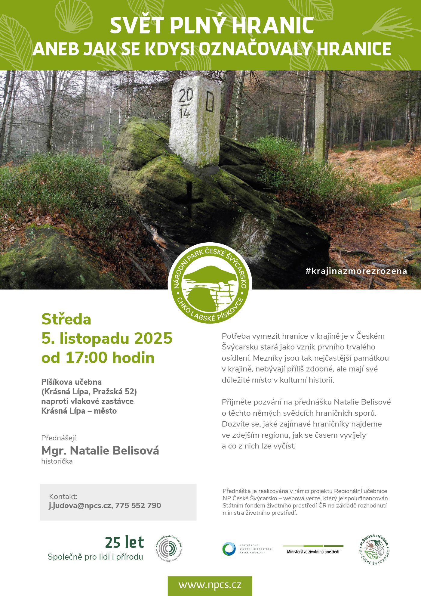 Potřeba vymezit hranice v krajině je v Českém Švýcarsku stará jako vznik prvního trvalého osídlení. Mezníky jsou tak nejčastější památkou v krajině, nebývají příliš zdobné, ale mají své důležité místo v kulturní historii. Přijměte pozvání na přednášku Natalie Belisové o těchto němých svědcích hraničních sporů. Dozvíte se, jaké zajímavé hraničníky najdeme ve zdejším regionu, jak se časem vyvíjely a co z nich lze vyčíst.